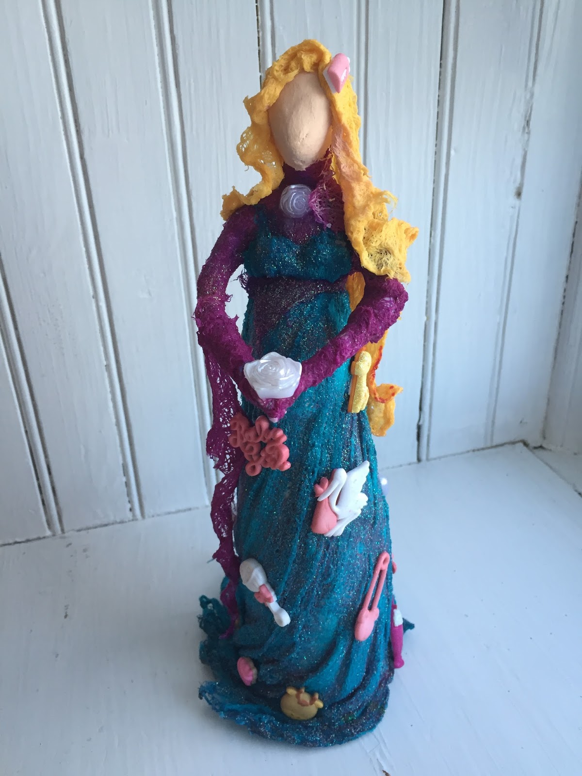 Little by little add more fabric and layer the wraps to cover all the clay and create the dress.